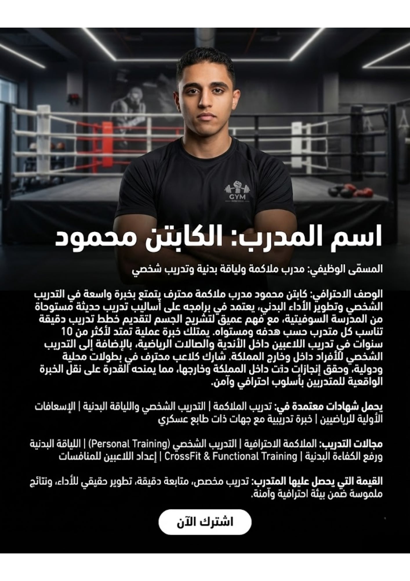 يُقدَّم التدريب داخل النادي بأعلى معايير السلامة والاحتراف، تحت إشراف مدرب معتمد وحاصل على شهادات احترافية في الملاكمة، اللياقة البدنية، والإسعافات الأولية للرياضيين.